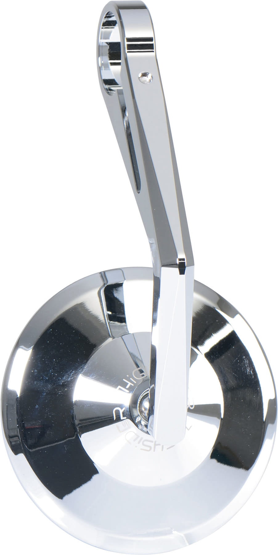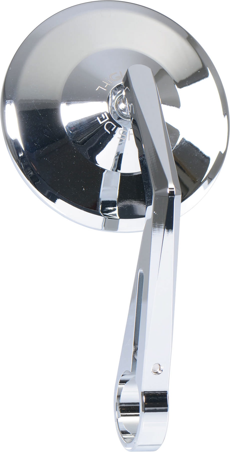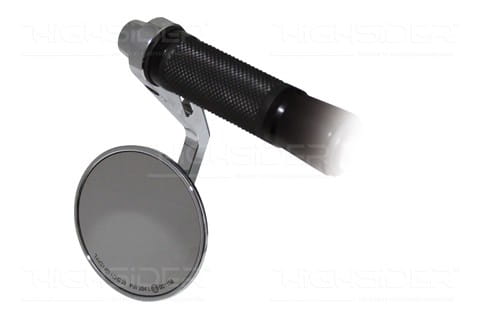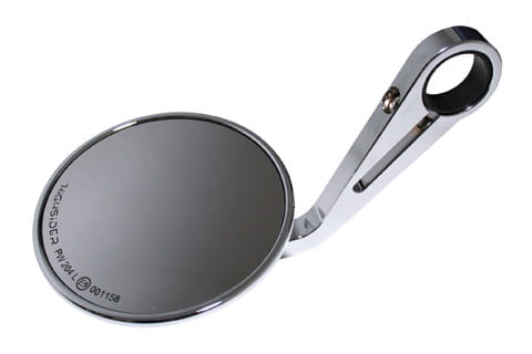 Universal handlebar end mirror, noble design, with a round head made of black anodized aluminum or chrome-plated. Fits 1 inch and 7/8 inch handlebars. Can be used for left and right side.