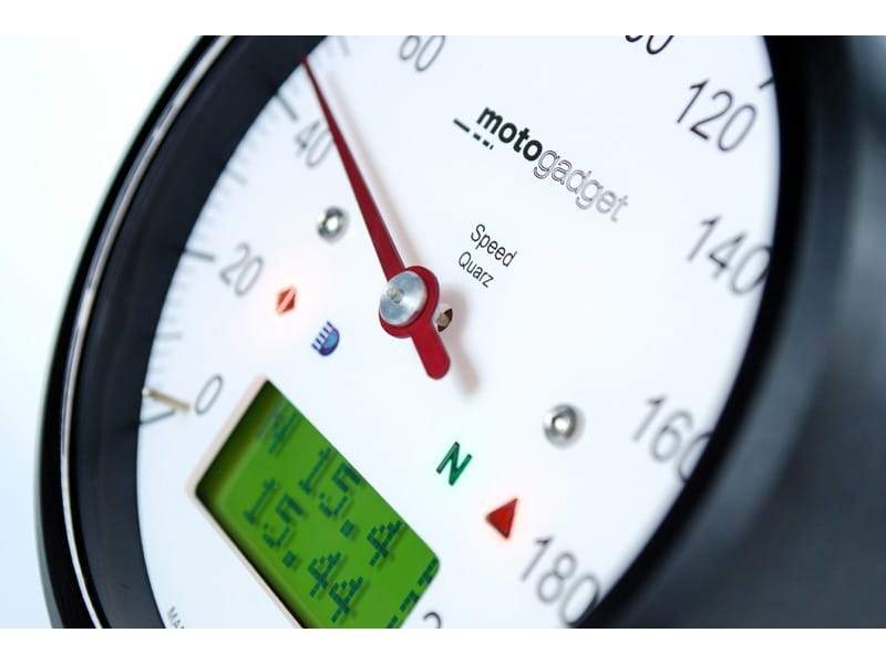 The Motoscope Classic speedo from Motogadget is an analogue speedometer with many additional digital features in a classic round casing. A white dial and a red indicator driven by a precision stepper motor comprise the analogue rev counter. An LCD display and four indicator LEDs indicate the additional features accurately and reliably.
