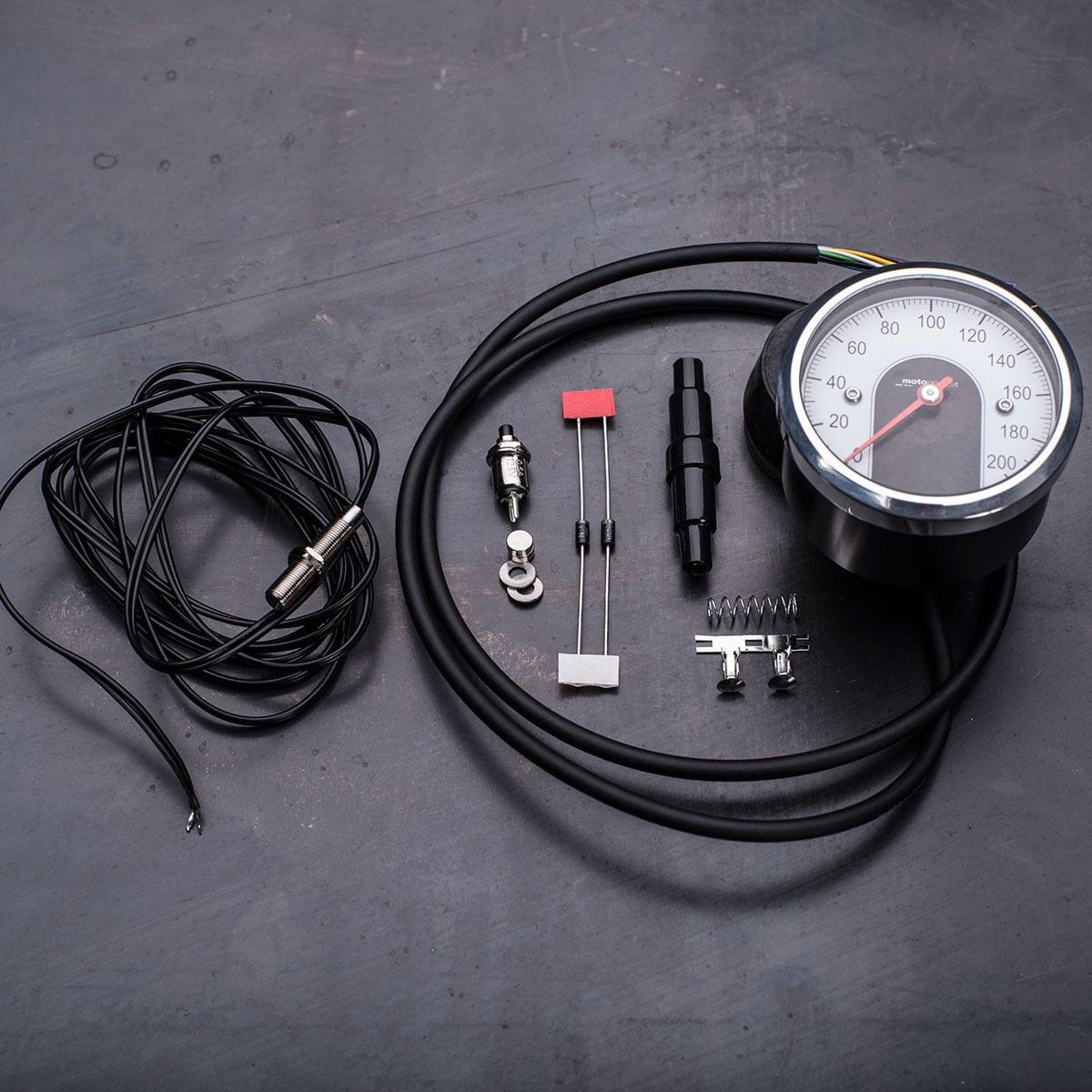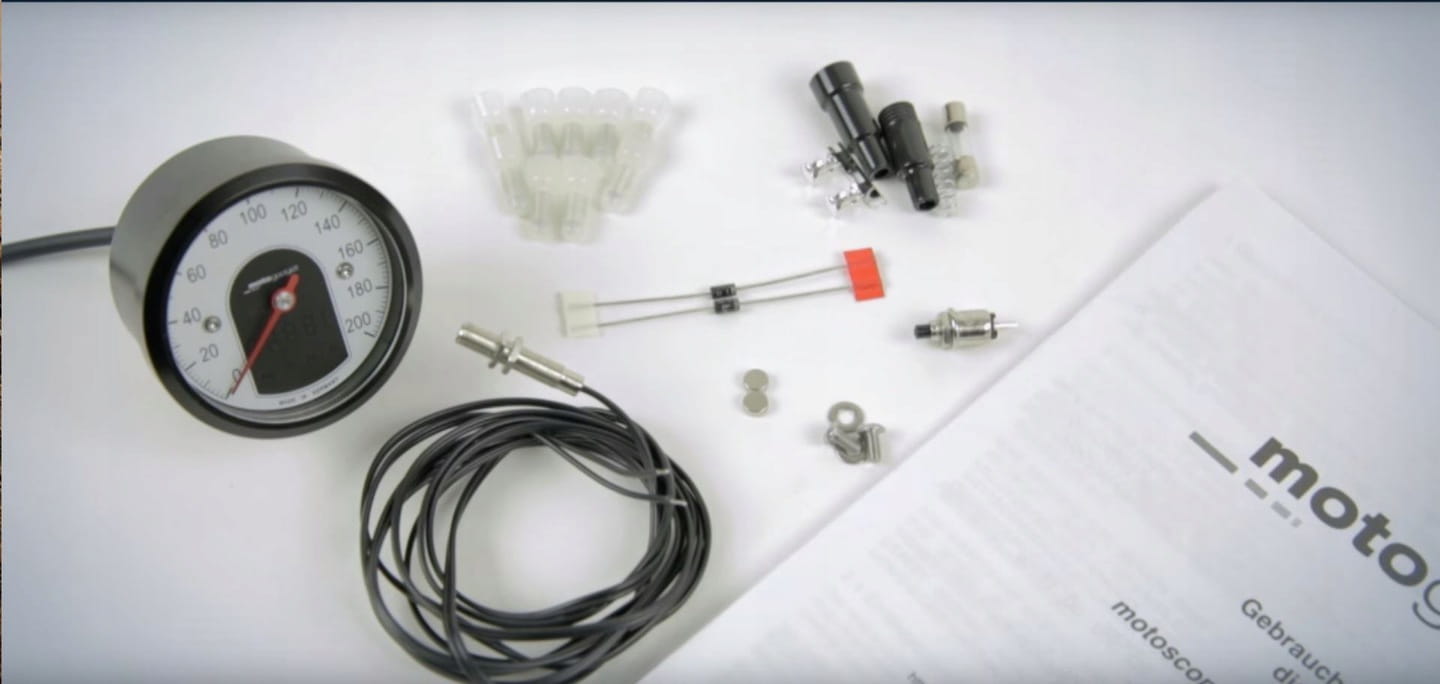 Dostarczony czujnik prędkościomierza ze stali nierdzewnej jest bardzo mały (M5/23 mm) i dzięki temu łatwy do ukrycia. Czujnik można łatwo zainstalować na przednim lub tylnym kole za pomocą kabla łączącego (długość 1,5 m). Pozwala to na łatwą konwersję oryginalnie mechanicznego napędu prędkościomierza w motocyklu. Motoscope Tiny jest kompatybilny z różnymi oryginalnymi czujnikami prędkościomierza (czujniki kontaktronowe i zbliżeniowe) producentów motocykli. W takim przypadku wystarczy podłączyć tylko zaciski, a mechaniczna instalacja czujnika będzie całkowicie zbędna. Inteligentna funkcja „Teach Function” umożliwia łatwą kalibrację prędkościomierza – nawet w pojazdach z czujnikami skrzyni biegów, np. Harley Davidson.