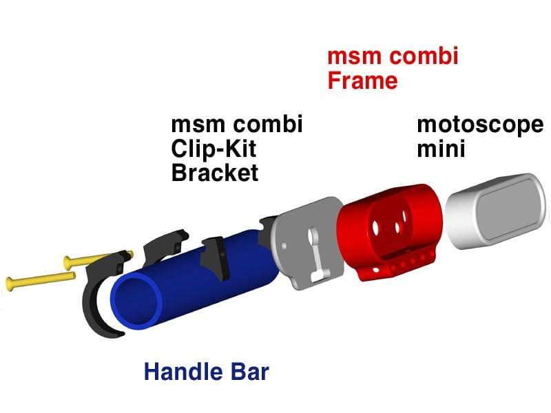 The Handle Bar Clip-Kit Bracket, together with the combi Frame, allows the motoscope mini to be mounted on the handlebars. The handlebars do not have to be drilled into for this purpose.