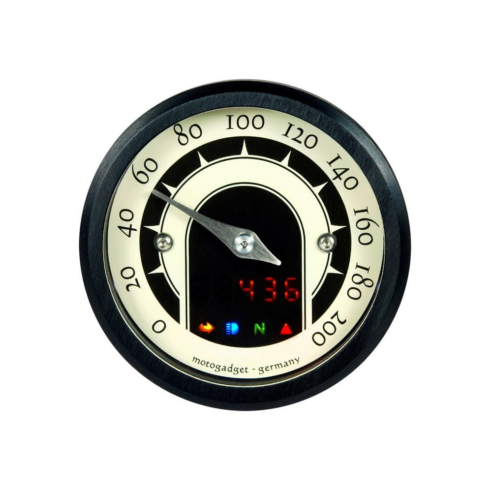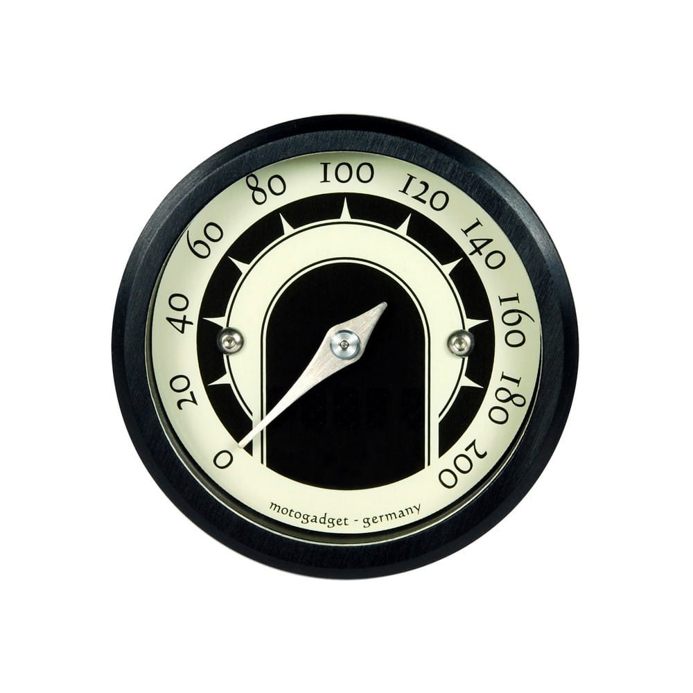 Motoscope speedster to mały, analogowy prędkościomierz o atrakcyjnym, zabytkowym designie. Tarcza wzorowana jest na opływowych wzorach z lat 40-tych i 50-tych. Kolor to dopasowana "cieplejsza" biel. Kształt wskaźnika jest dopasowany do projektu tarczy i wykonany ze szczotkowanej stali nierdzewnej. Dostępna jest ramka w „polerowanym wykończeniu” lub „czarnym anodowanym”.