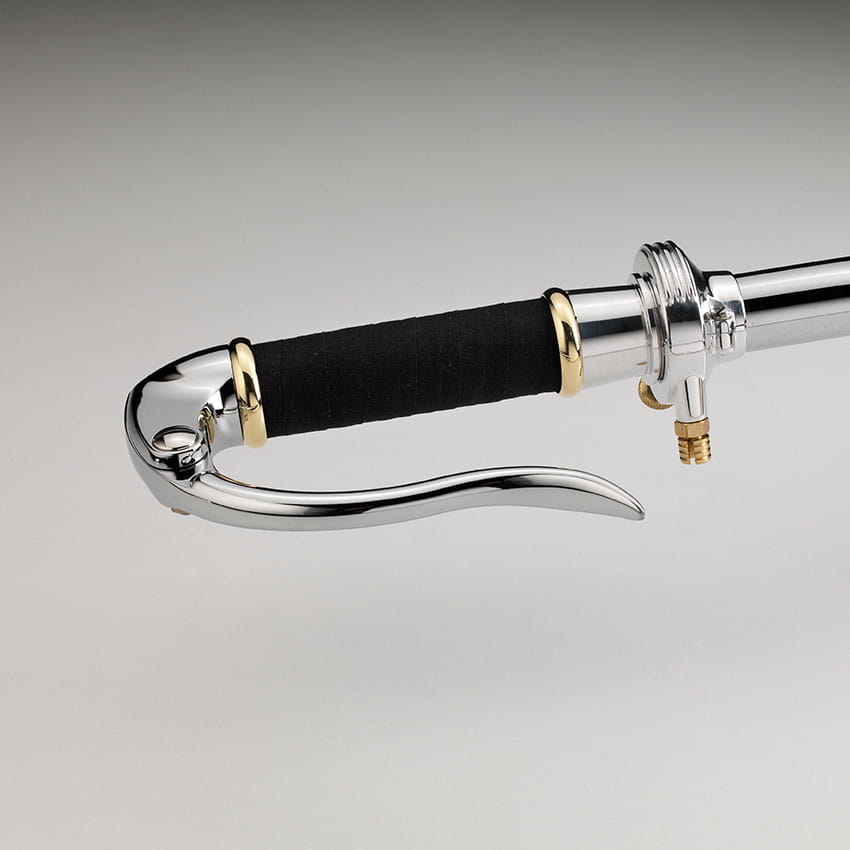 - Polished forged aluminum with brass tension screw and cable adjuster.