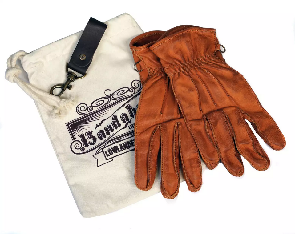 The 13 and a half full grain cowhide Lowlander short gloves will look better the more you wear them. They come with a groovy brass and leather clip to keep them on your belt while having a stiff drink.