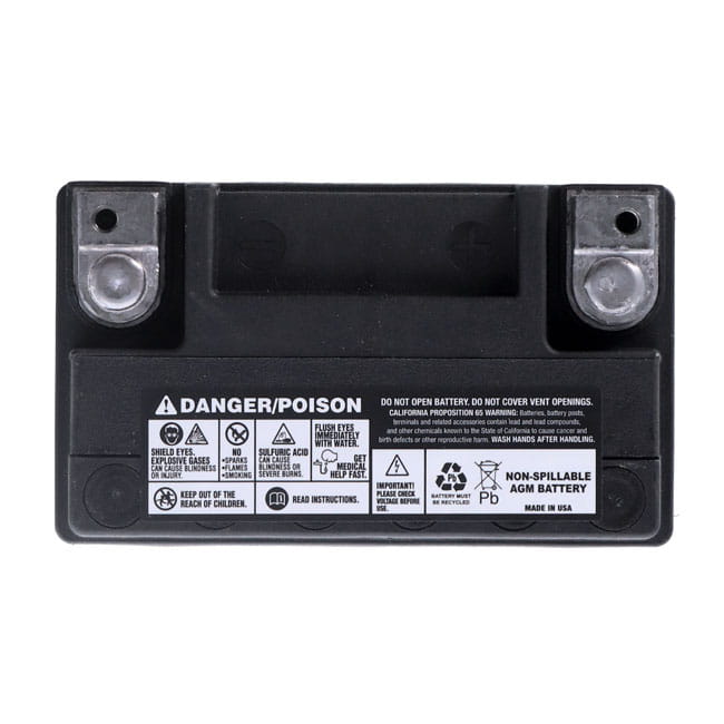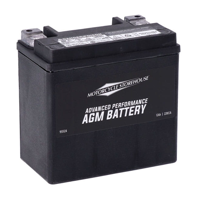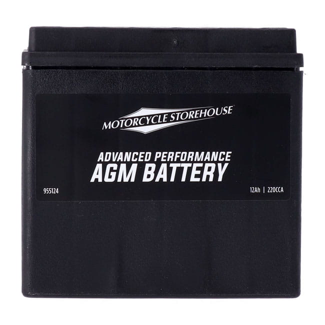 220CCA (Cold Cranking Amps). The MCS 'Advance Series' AGM batteries, synonym for a great battery. These high-end Motorcycle Storehouse AGM (Absorbed Glass Mat) 'Advance' batteries are of excellent quality, sealed and maintenance free (just keep them charged). They offer low internal resistance, less heat build-up and a strong starting capacity, much better than compatible flooded acid type batteries. AGM batteries are charged during production but will require a re-charge before installation. Height 149mm x Length 148mm x Width 85mm. OEM replacement reference 65948-00B, 66000206. Note before installation: Never start the engine before you have fully charged your new battery, to prevent irreversible damage that will ultimately shorten its life span. It is absolutely mandatory to fully charge any new AGM battery before installation. After production AGM batteries are factory activated and will, during storage, slowly discharge. Re-charge at least every 3 months. Recharging sooner may be required in hotter or cooler temperatures. Vehicle electronics, like a clock, alarm etc. will additionally drain an installed battery. AGM batteries will not handle a too deep discharge well. Keep them charged at a minimum of 12.4V for best performance through its life span. Connect the battery to a suitable automatic 'maintenance charger' when not in use for a period of time to retain the optimum charge level.