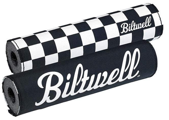 Fits crossbar-equipped handlebars. Foam bar pad with a durable reversible nylon cover, used to help keep your teeth where they belong. Checkered flag print on one side, the other side is black with a white Biltwell logo. Dimensions: 8.25" long, 2" diameter with a 3/4" center hole.