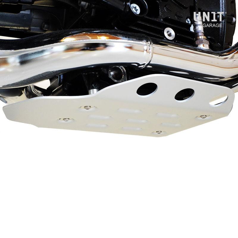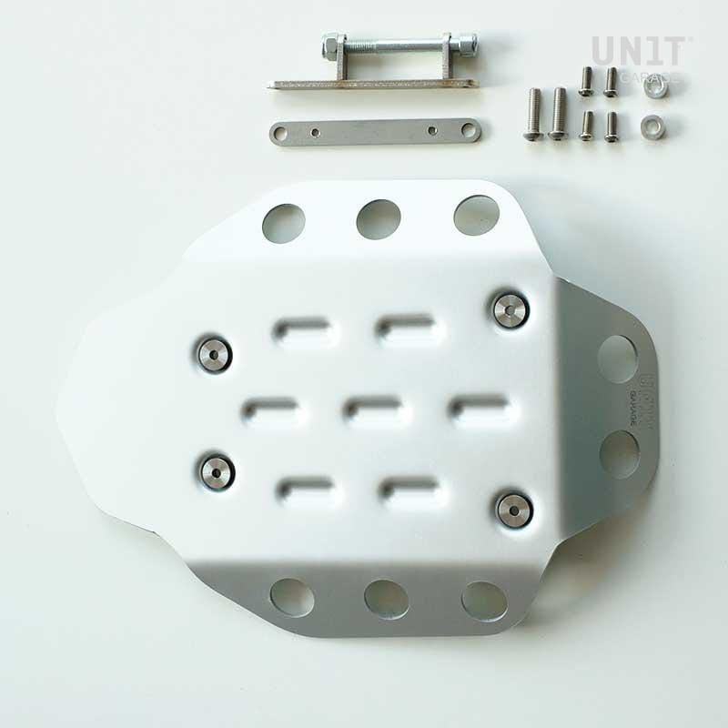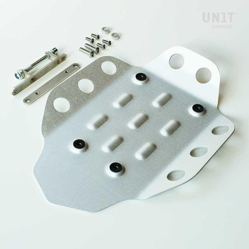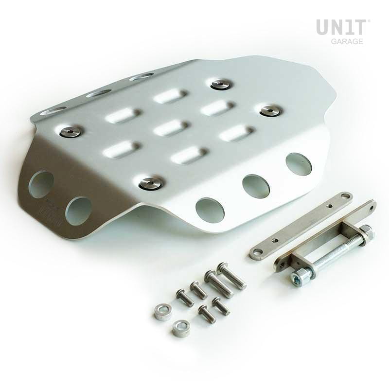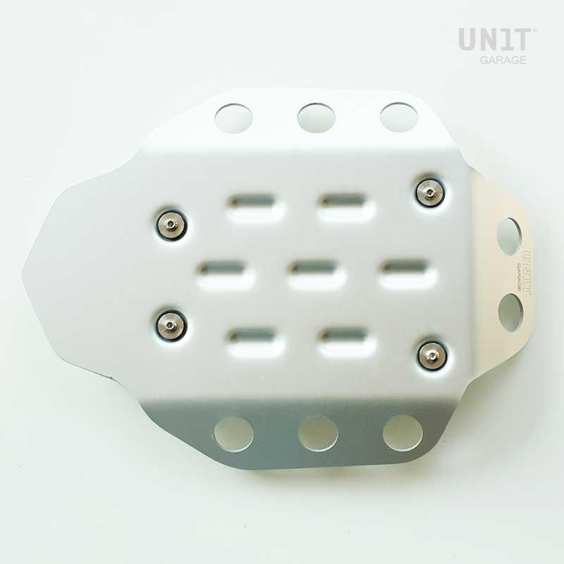 Wykonany z lekkiego stopu Peraluman o grubości 3 mm, jest gięty na zimno. Wyraźne żebra zastosowane dla większej wytrzymałości w połączeniu z uproszczonymi wspornikami montażowymi zapewniają mocną konstrukcję i łatwy montaż . Płyta jest większa niż oryginalny model i jest ukształtowana tak, aby chronić kolektory wydechowe z przodu i w najbardziej odsłoniętym obszarze katalizatora. Jest dostarczany ze śrubami, gumami antywibracyjnymi etc.