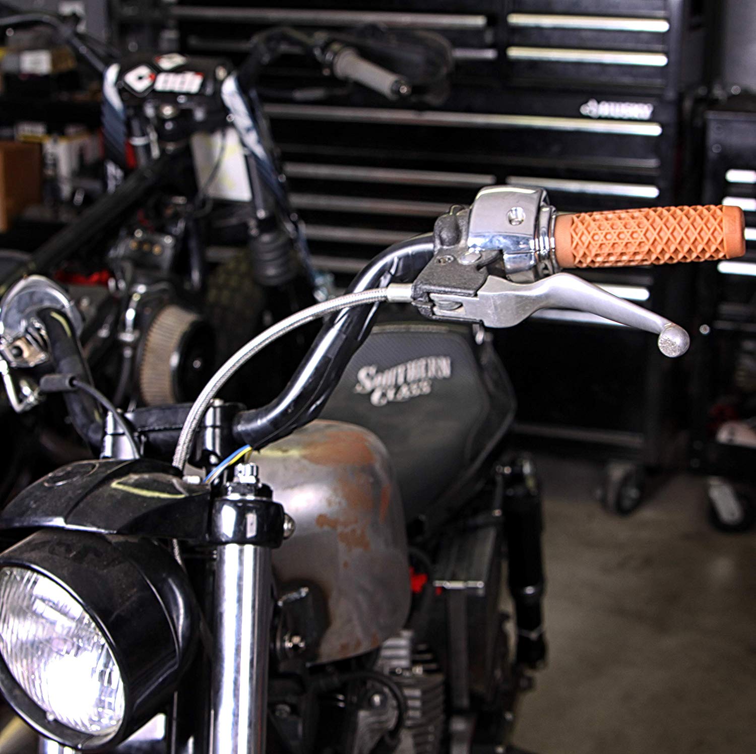 Klasyczne gumowe manetki na kierownicę 22mm. (Dostępne również w wersji 1" = 25,4 cm). Jedna manetka na rolgaz ma szerszy otwór, druga węższy. Idealnie nadaję się do każdego motocykla w klimacie oldschool :