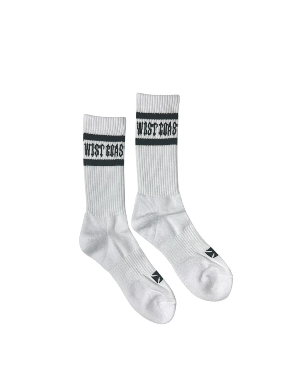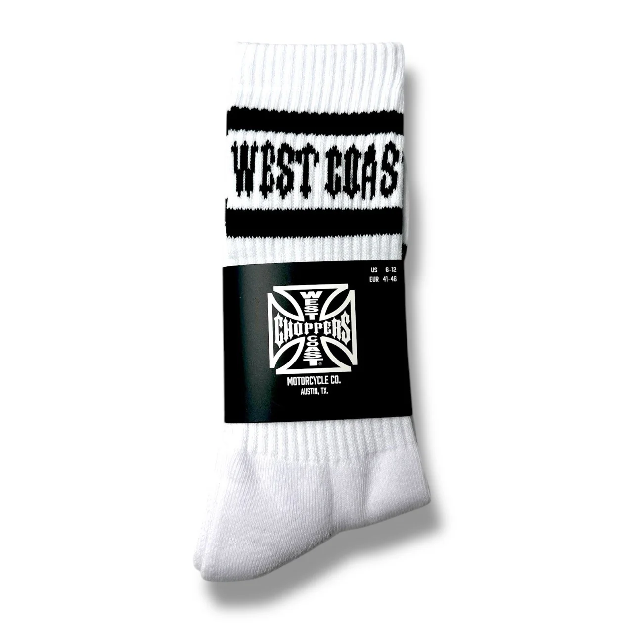 Pair of white crew socks with West Coast Choppers around the leg en the cross logo at the upper feet.