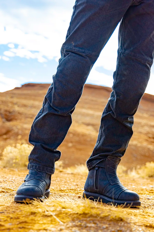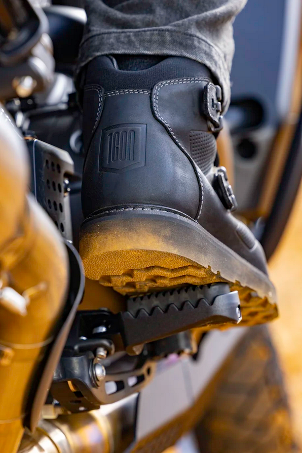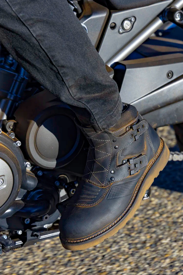 El Bajo – literally translated it means 'The Short One.' Short perhaps in the overall height, but never in performance or steez. Built on the same Goodyear welt bottom unit as its five-buckle Elsinore2™ brother. El Bajo2™ provides all the OG moto-presence but in a reduced two-buckle silhouette. Metal post fasteners, heavy top-grain leather chassis, and durable toe box and heel make for a serious piece of riding footwear. El Bajo2™, always up to the challenge.