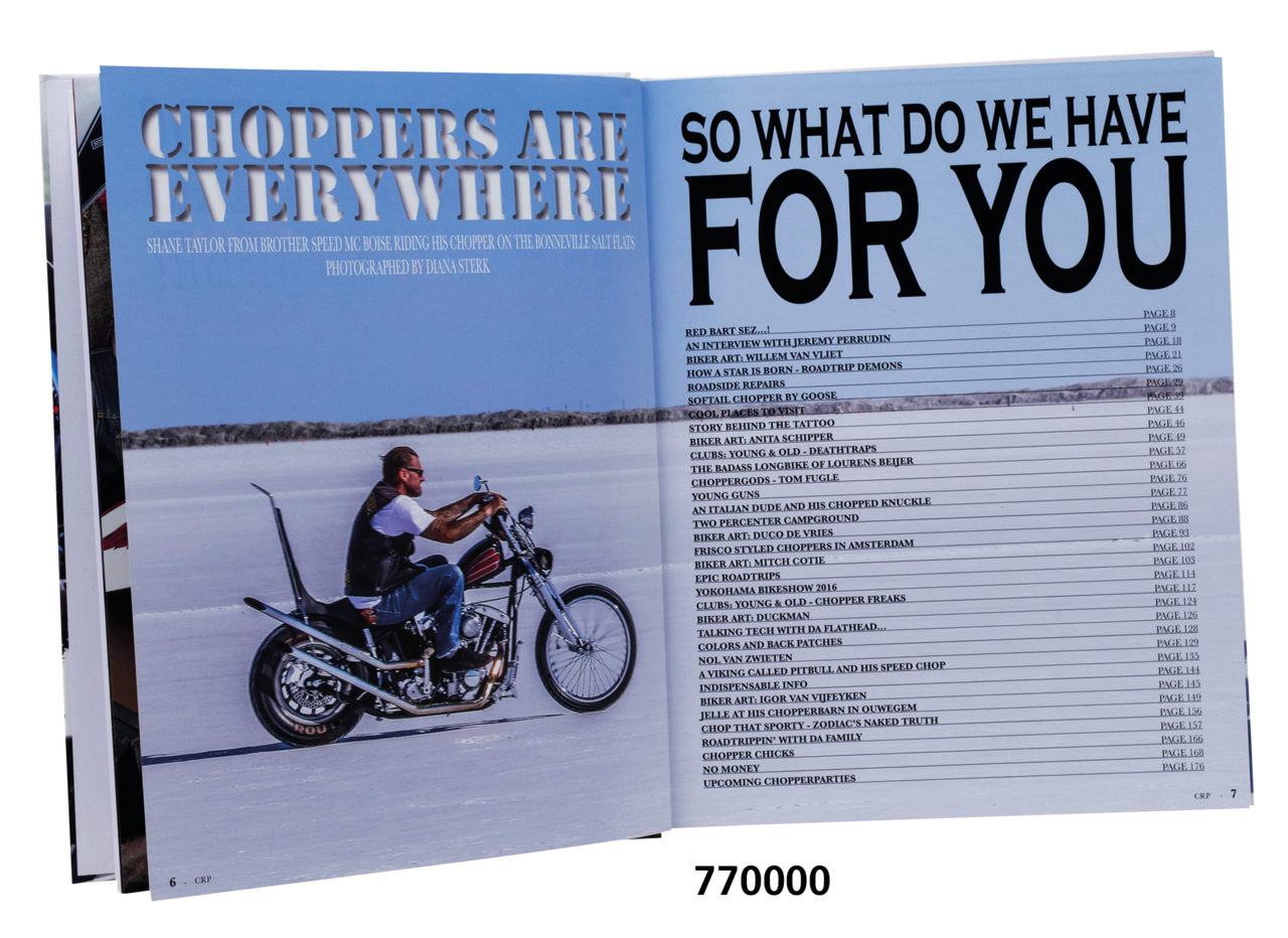 Seria książek autorstwa holenderskiego fanatyka hardcorowych chopperów i autora Tona „Beera” Beerepoota, znanego wcześniej jako Grizzly. W tych wielostronicowych książkach w twardej oprawie o wymiarach 21,7 x 27,7 cm, które czyta się jak magazyny starej szkoły, Beer stara się dokumentować i promować ekscytujący styl życia chopperów. Na całym świecie, ale ze szczególnym uwzględnieniem Europy. Szybko rozwijający się styl życia motocyklisty, zbliżony do tego z lat siedemdziesiątych, skupiający się na zabawie i czynieniu życia piękniejszym. Te wysokiej jakości książki są pełne zabójczych zdjęć, historii i wszystkiego, co musisz wiedzieć o dwóch procentach wszystkich motocyklistów, którzy nadal jeżdżą i budują choppery.