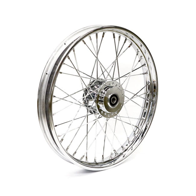 Chrome plated 40-spoke replacement spoke wheel, laced and trued. Seals are installed, bearing spacing is pre-set and wheel is ready for installation. Wider than stock wheels are for wide tire applications. An OEM fitment may not be applicable due to OEM width restrictions in fender, belt, etc. Note: For all wire wheels it is advised to check spoke tension before installing the tire. After approx. 250km the spoke tension must be checked again to insure a correct spoke tension. After each 5000km, or as part of regular maintenance, a spoke-check is advised to insure spoke tension is still correct.