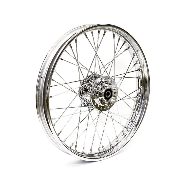 Chrome plated 40-spoke replacement spoke wheel, laced and trued. Seals are installed, bearing spacing is pre-set and wheel is ready for installation. Wider than stock wheels are for wide tire applications. An OEM fitment may not be applicable due to OEM width restrictions in fender, belt, etc. Note: For all wire wheels it is advised to check spoke tension before installing the tire. After approx. 250km the spoke tension must be checked again to insure a correct spoke tension. After each 5000km, or as part of regular maintenance, a spoke-check is advised to insure spoke tension is still correct.