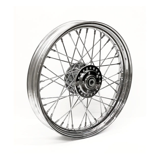 Can be used as a front or rear wheel. Chrome plated 40-spoke replacement spoke wheel, laced and trued. Seals are installed, bearing spacing is pre-set and wheel is ready for installation. Wider than stock wheels are for wide tire applications. An OEM fitment may not be applicable due to OEM width restrictions in fender, belt, etc. Note: For all wire wheels it is advised to check spoke tension before installing the tire. After approx. 250km the spoke tension must be checked again to insure a correct spoke tension. After each 5000km, or as part of regular maintenance, a spoke-check is advised to insure spoke tension is still correct.