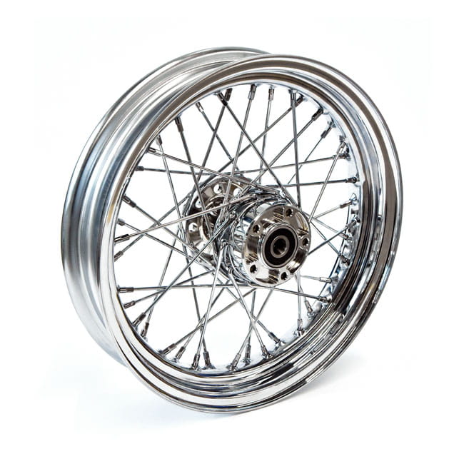 Can be used as a front or rear wheel. Chrome plated 40-spoke replacement spoke wheel, laced and trued. Seals are installed, bearing spacing is pre-set and wheel is ready for installation. Wider than stock wheels are for wide tire applications. An OEM fitment may not be applicable due to OEM width restrictions in fender, belt, etc. Note: For all wire wheels it is advised to check spoke tension before installing the tire. After approx. 250km the spoke tension must be checked again to insure a correct spoke tension. After each 5000km, or as part of regular maintenance, a spoke-check is advised to insure spoke tension is still correct.