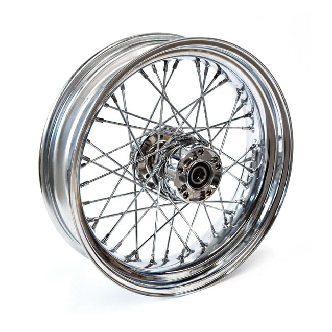 Chrome plated 40-spoke replacement spoke wheel, laced and trued. Seals are installed, bearing spacing is pre-set and wheel is ready for installation. Wider than stock wheels are for wide tire applications. An OEM fitment may not be applicable due to OEM width restrictions in fender, belt, etc. Note: For all wire wheels it is advised to check spoke tension before installing the tire. After approx. 250km the spoke tension must be checked again to insure a correct spoke tension. After each 5000km, or as part of regular maintenance, a spoke-check is advised to insure spoke tension is still correct.