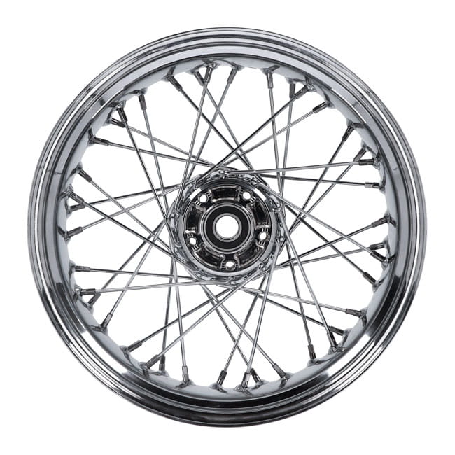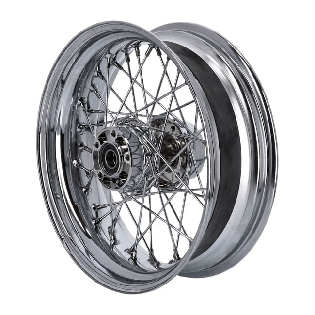 Chrome plated 40-spoke replacement spoke wheel, laced and trued. Seals are installed, bearing spacing is pre-set and wheel is ready for installation. Wider than stock wheels are for wide tire applications. An OEM fitment may not be applicable due to OEM width restrictions in fender, belt, etc. Note: For all wire wheels it is advised to check spoke tension before installing the tire. After approx. 250km the spoke tension must be checked again to insure a correct spoke tension. After each 5000km, or as part of regular maintenance, a spoke-check is advised to insure spoke tension is still correct.