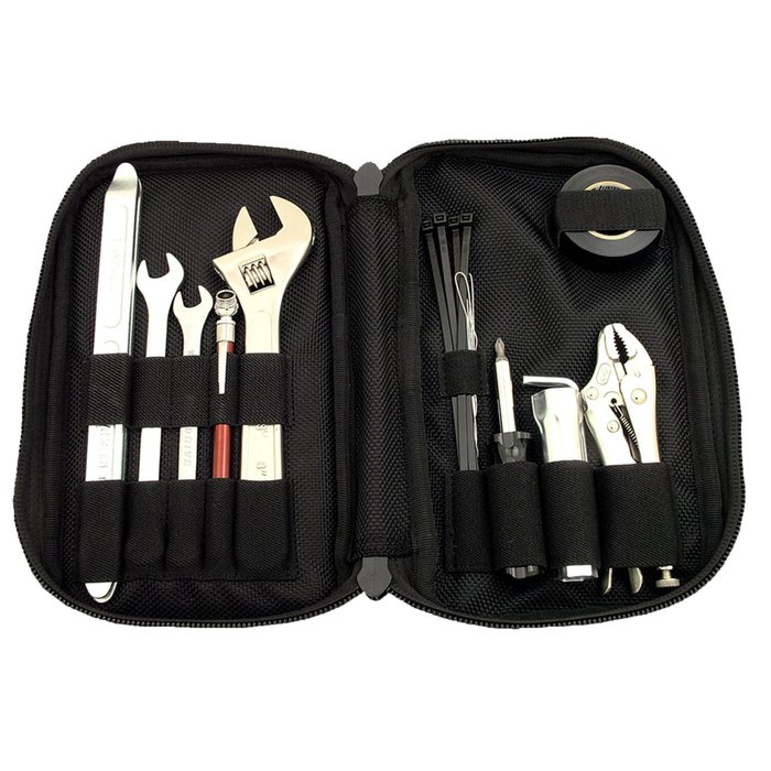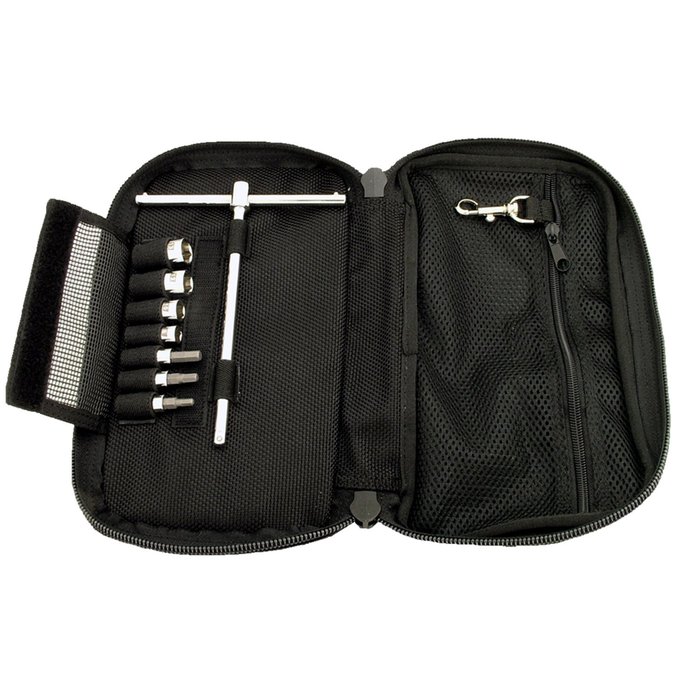 Kompletny zestaw narzędzi montowanych na błotniku do motocykli terenowych, quadów, UTV lub skuterów śnieżnych, zawierający klucze płasko-oczkowe, miniaturowy uchwyt T z nasadkami, nasadki do świec zapłonowych, klucz nastawny, szczypce zaciskowe, manometr, łyżki do opon, taśmę klejącą, opaski zaciskowe, linkę montażową oraz luksusowe etui zapinane na zamek, które pozwoli Ci utrzymać wszystko w porządku. W komplecie z zestawem do montażu na błotniku i pokrowcem przeciwdeszczowym/przeciwpyłowym. Dożywotnia gwarancja – bez zadawania pytań!