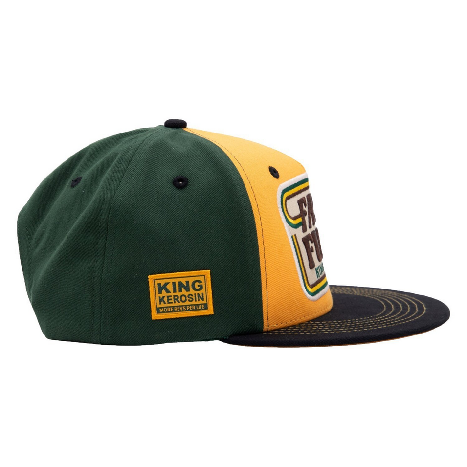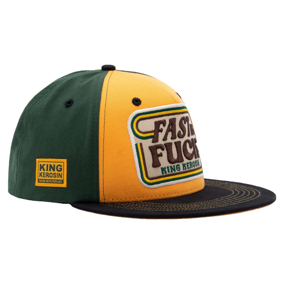 Napis „Fast as Fuck” jest wyraźnie wyeksponowany jako duża, haftowana naszywka z przodu, co od razu pokazuje, o co chodzi w tej czapce: szybkość, bezpośredniość i brak zbaczania z kursu. Czapka King Kerosin łączy klasyczny kształt płaskiego daszka z efektownym wzorem panelowym i przyciągającym wzrok akcentem. Kontrastowe przeszycia na daszku, tkana metka King Kerosin z boku i nadrukowany spód daszka z napisem dodają dodatkowych detali. Dzięki zapięciu na zatrzask czapka jest regulowana i będzie Ci towarzyszyć na spotkaniach samochodowych, w podróży i na co dzień.