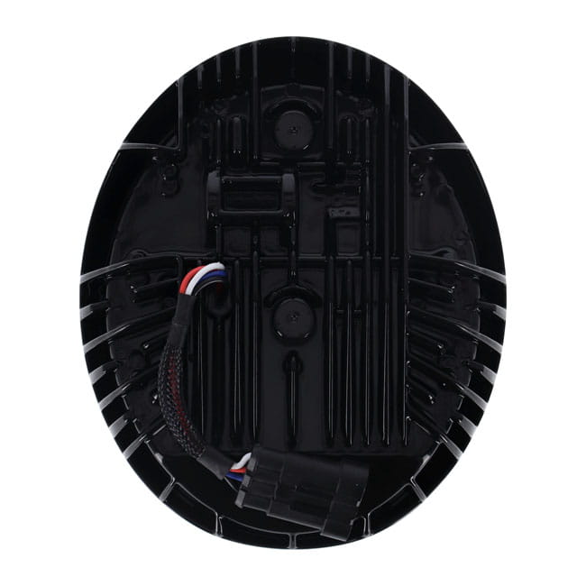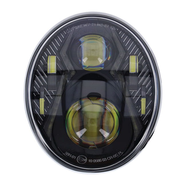 ECE & DOT approved. Black bezel. With a white halo ring/position light. Economical high/low beam LED conversion head lamp unit to replace the stock H4 unit. LEDs are an improvement at all levels when compared to H4 lighting and offer more effective and whiter light at 6000K, much better reliability and less amperage draw. - White halo-ring/position light - Unit comes complete with wiring with a 3-prong plug that is identical to a standard H4 light bulb, allowing a plug & play conversion - Compatible with left side (UK) & right side (EU) driving - 182mm (7.16") diameter - 96mm (3.78") deep - 6000K color temperature - Theoretical power at high beam 72W - 12-Volt DC. - Passing beam 3 LEDs 23W - Driving beam 1 LED 40W - Halo ring/position light 40 LEDs 2.4W - Approval E24*50R01/00*0586*00