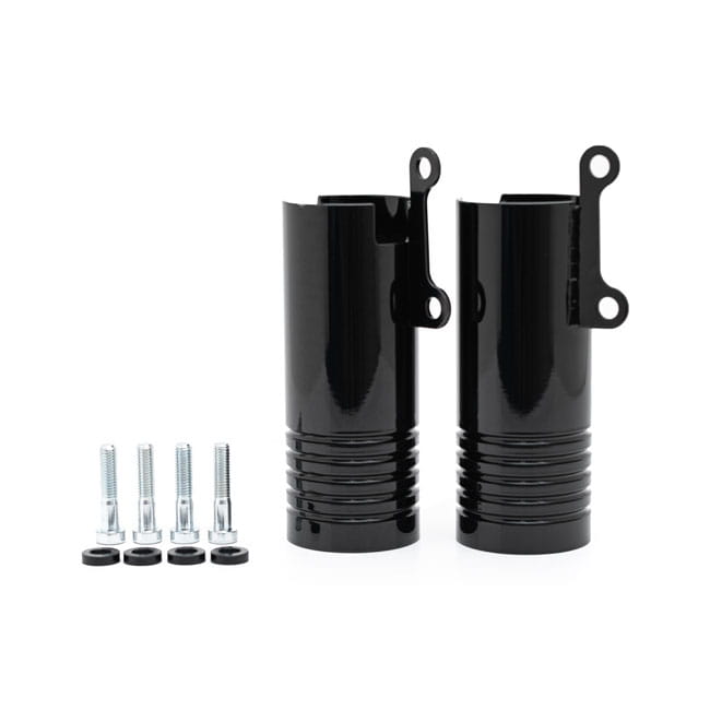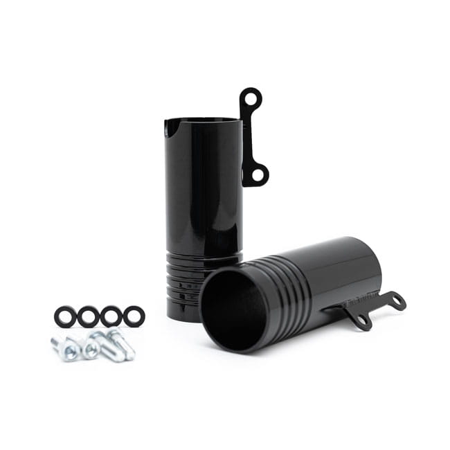 CNC machined billet aluminum with a gloss black powder coated finish. Designed to cover the lower fork tubes of the upside down fork. This transforms the fork to a massive blackout Fat Fork look. Installs directly to the caliper mounts.