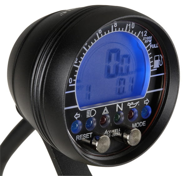 Wielofunkcyjny wyświetlacz LCD podświetla się na podświetlanym niebieskim ekranie, wyświetlając zarówno prędkość, jak i obroty w formacie cyfrowym.