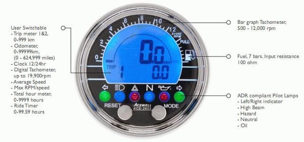 Cyfrowy prędkościomierz ACE-2853 firmy Acewell jest zatwierdzony przez ADR i dopuszczony do ruchu drogowego dla samochodów osobowych i motocykli w Australii i Nowej Zelandii. Możliwość montażu płaskiego 2853 sprawia, że jest bardzo popularny wśród konstruktorów motocykli niestandardowych.