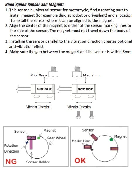 - Speedo można zamontować podtynkowo lub zainstalować za pomocą dostarczonego wspornika montażowego. Przystawka prędkości Acewell wykorzystuje kontaktron i magnes. Oba są zawarte w zestawie. W przypadku motocykli wystarczy wymienić śrubę w przednim wirniku tarczy na dołączoną śrubę magnetyczną i wyrównać kontaktron z magnesem. Następnie zaprogramuj obwód opony w Acewell. To obliczy odczyty prędkości, podróży i licznika kilometrów. W przypadku samochodów po prostu upewnij się, że magnes przechodzi przez czujnik przy każdym obrocie opony. Można to zrobić za pomocą kół, wałka napędowego lub innych obracających się części.