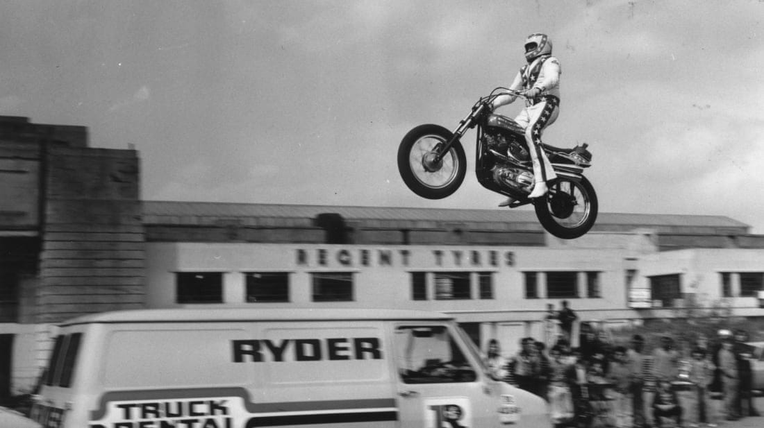 Evel Knievel! Kto go nie zna, kto o nim nie słyszał. To człowiek legenda! Najbardziej znany był z długodystansowych skoków motocyklowych: jego 50-metrowy skok nad Fontanną Cezara w Las Vegas 31 grudnia 1967 r. przyniósł mu sławę, choć jego upadek spowodował miesięczną śpiączkę.