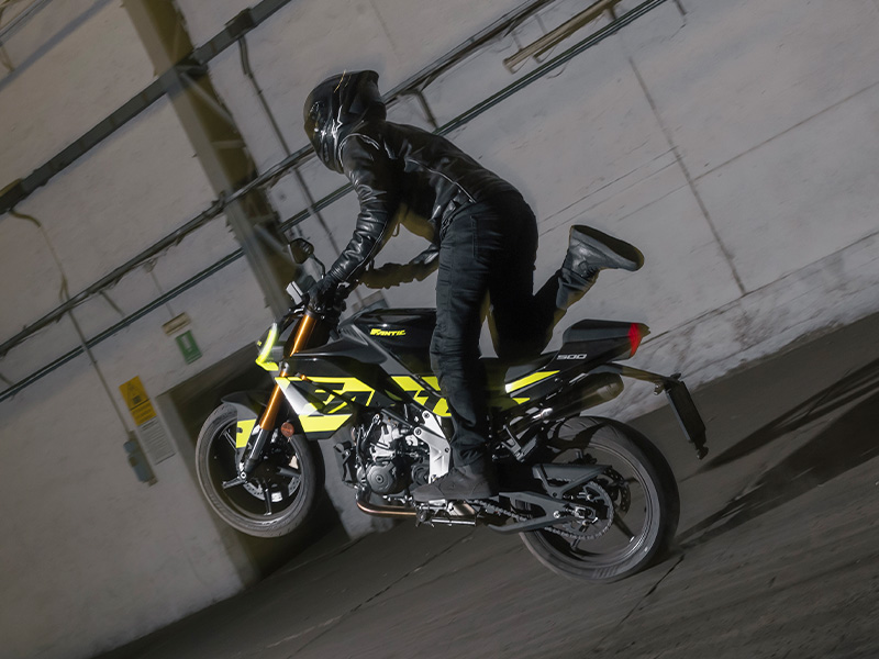 Stealth 500 to najlżejszy naked bike klasy 500, ważący zaledwie 147 kg na sucho. Ta cecha definiuje jego charakter: zwinny, łatwy w prowadzeniu i potrafiący pokonać każdy zakręt, zachęcając do jeszcze większej prędkości. Motocykl został zaprojektowany z myślą o redukcji masy każdego elementu, od ramy po ostatnią śrubę. Idealny na ciasne zakręty, w korkach i na długie przejażdżki, zapewnia wyjątkowe wrażenia z jazdy dla zapalonych motocyklistów i miłośników wolności na dwóch kółkach. Dzięki wysokości siedziska wynoszącej 810 mm, odpowiedniemu rozłożeniu masy i rozstawowi osi wynoszącemu 1368 mm Stealth 500 oferuje idealną równowagę między kontrolą a swobodą ruchów. 12-litrowy zbiornik paliwa sprawia, że motocykl jest smukły między nogami, a pozycja za kierownicą łączy w sobie wygodę i szybkość reakcji: jest wystarczająco swobodna do codziennego użytku, ale wystarczająco sportowa, aby poczuć każdy zakręt.