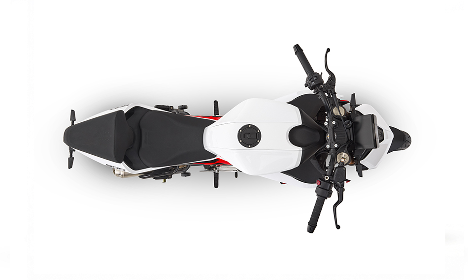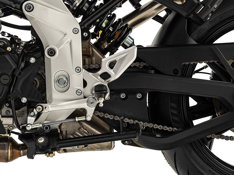 Każdy element został umiejscowiony tak, aby zoptymalizować równowagę, kontrolę, stabilność i komfort, zarówno podczas sportowej jazdy, jak i codziennego użytkowania. Zbiornik paliwa znajduje się blisko środka ciężkości motocykla, co zapewnia równomierne rozłożenie masy. Układ wydechowy działa na tej samej zasadzie: tłumik, umieszczony wysoko, redukuje wpływ masy bez uszczerbku dla lekkości, estetyki i osiągów, a komora rozprężna, umieszczona nisko, obniża środek ciężkości, poprawiając stabilność i przyczepność, szczególnie podczas przyspieszania i pokonywania zakrętów. Aby zagwarantować najlepsze wrażenia z jazdy, motocykl został wyposażony w regulowane dźwignie hamulca i sprzęgła, a także dźwignie hamulca i zmiany biegów z dwoma regulowanymi pozycjami. Elementy te pozwalają na w pełni spersonalizowaną konfigurację, zaprojektowaną tak, aby spełnić potrzeby każdego kierowcy i zapewnić optymalny komfort i kontrolę w każdej sytuacji.