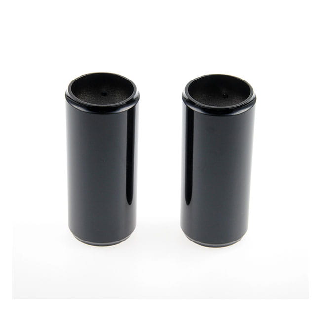 Gloss black powder coated CNC machined aluminum covers. Fits between upper and lower triple tree for that massive muscle bike look. Mounts with included set-screws.