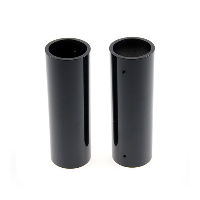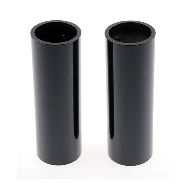 Gloss black powder coated CNC machined aluminum covers. Fits between upper and lower triple tree for that massive muscle bike look. Mounts with included set-screws.