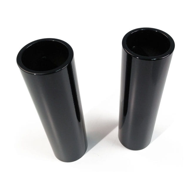 Gloss black powder coated CNC machined aluminum covers. Fits between upper and lower triple tree for that massive muscle bike look. Mounts with included set-screws.