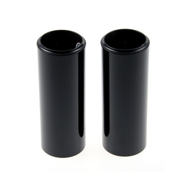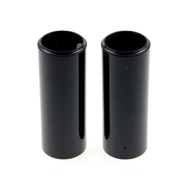 Gloss black powder coated CNC machined aluminum covers. Fits between upper and lower triple tree for that massive muscle bike look. Mounts with included set-screws.