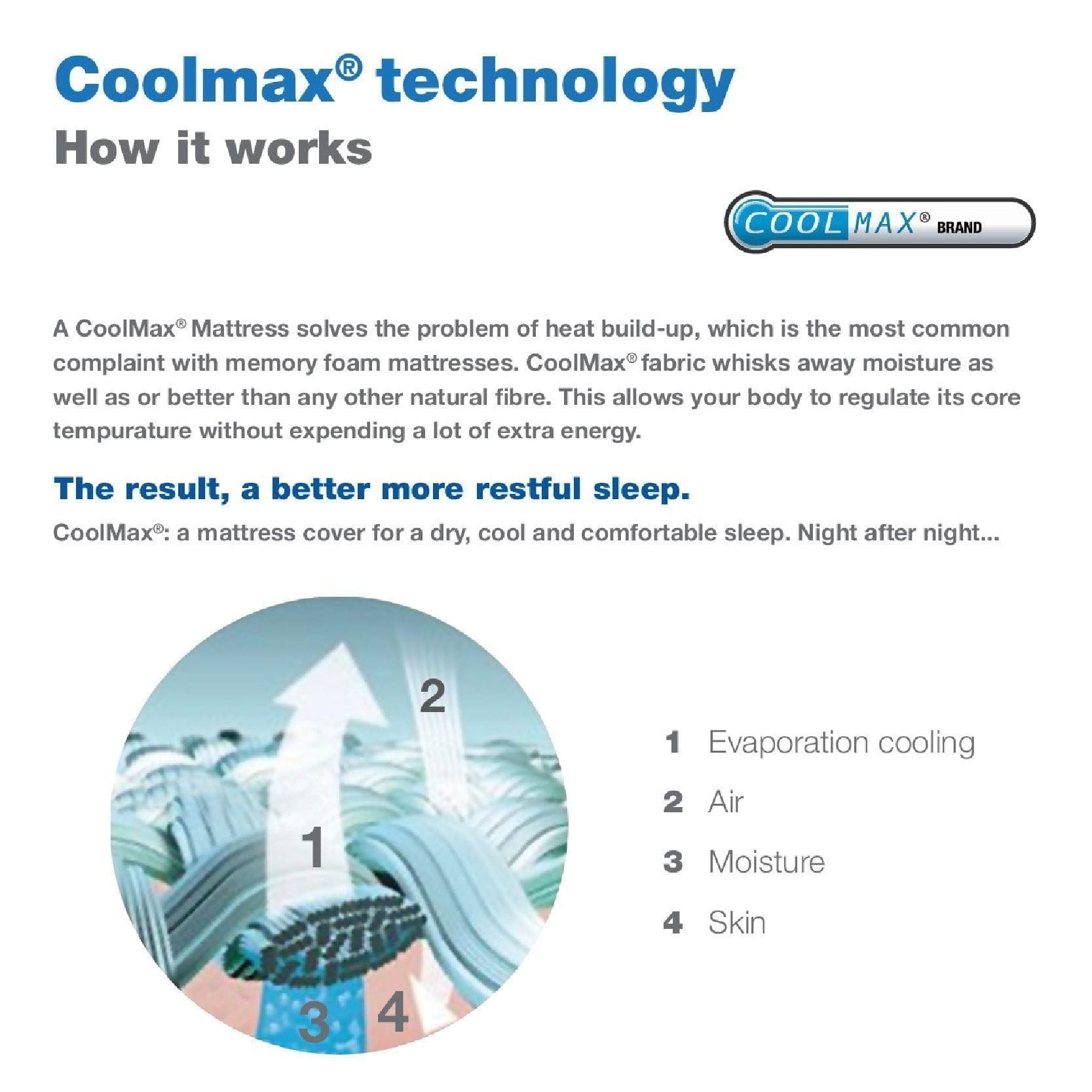 Wykonane z tkaniny Coolmax®, tkaniny technicznej opracowanej, aby utrzymać ciepło i zwiększyć komfort. Tkaniny coolmax® są wykonane z włókien poliestrowych poddanych specjalnej obróbce, która tworzy szczególną strukturę powierzchni. Te kwadratowe lub sześciokątne włókna przenoszą wilgoć ze skóry na zewnętrzną powierzchnię tkaniny. Wilgoć wysycha szybciej niż w innych tkankach i reguluje temperaturę ciała za pomocą chłodzenia wyparnego.