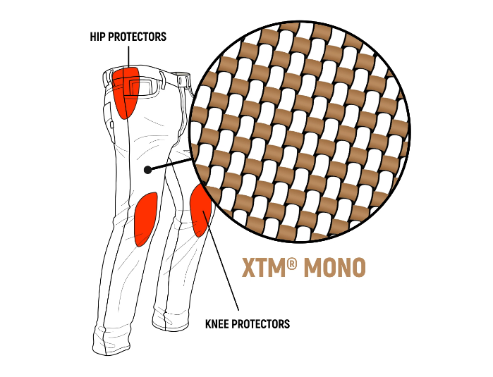 Osiągnęliśmy to dzięki specjalnemu procesowi tkania, który łączy tkaninę dżinsową z naszym włóknem XTM®. W połączeniu z ochraniaczami w okolicy kolan i bioder jesteś przygotowany na wszystko, co spotkasz po drodze.