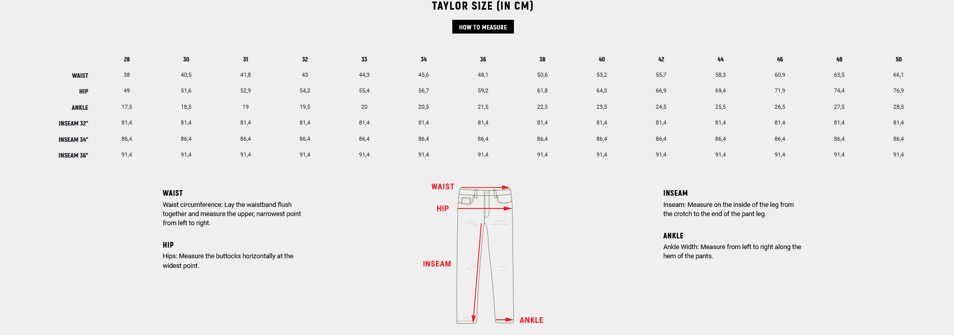 - Tapered Fit: wider at the hips; close-fitting at the ankle