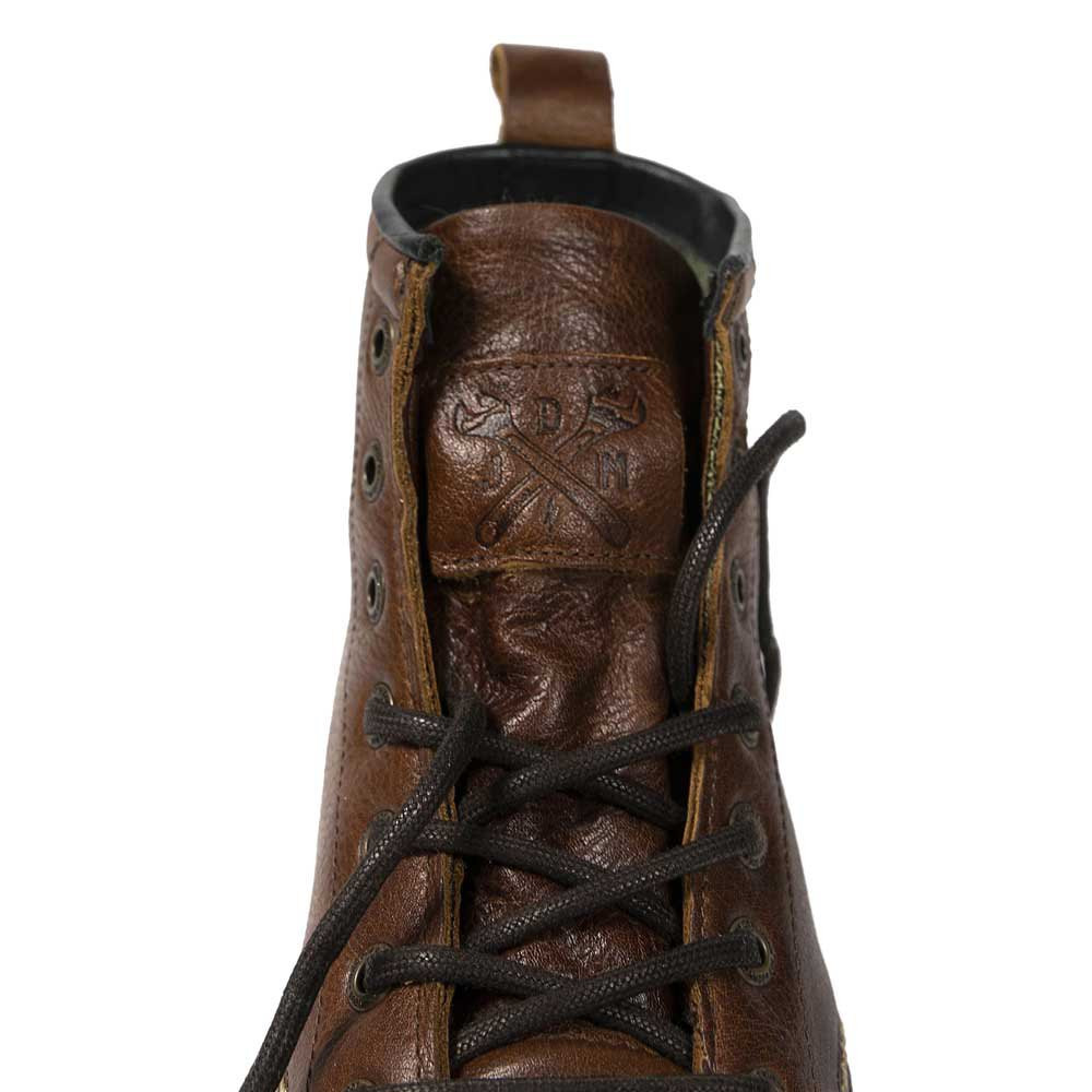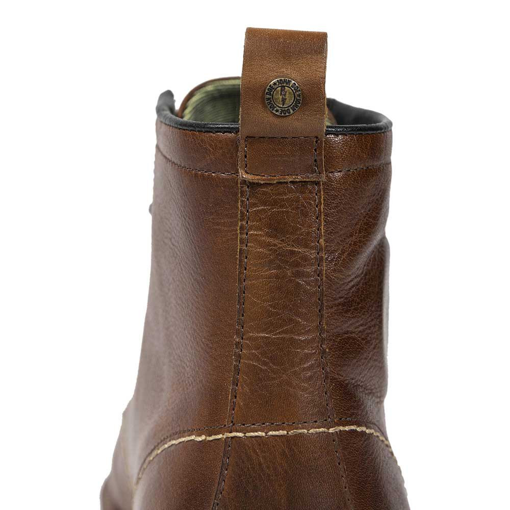 Wszystkie nasze buty motocyklowe mają oczywiście również funkcję "zatrzymywania wody" (jak buty trekkingowe i turystyczne), tj. Język ma za zadanie zapobiegać szybkiemu przenikaniu wody do buta przy sznurowadłach. Odporna na olej, antypoślizgowa podeszwa antypoślizgowa jest również standardem w butach motocyklowych John Doe. Piękna zabytkowa skóra z kontrastowymi przeszyciami i metalowym emblematem JDM na zakładce dodają charakteru.