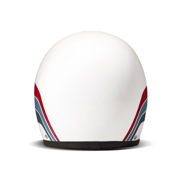Kask jet Retro Artemis, błyszczący w kolorze białym z prostym wzorem dekoracyjnym w odcieniach niebieskiego, błękitnego i czerwonego, to idealny produkt dla motocyklisty, który kocha styl lat 70., ale także dla użytkownika skutera, który szuka wygodnego, małego, bezpiecznego i oryginalnego kasku.