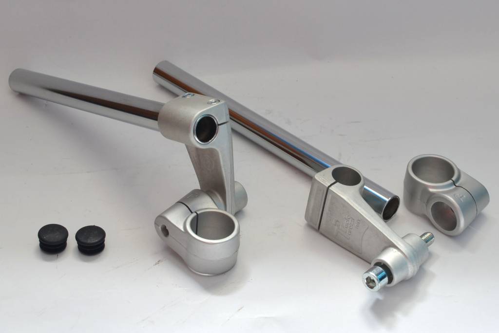 Adjustable clip-ons, High Rise, by Paolo Tarozzi of Bologna. Alloy stanchion clamp and chromed steel 22 mm handlebar. 'Bridging piece' raises the axis of the handlebar by approximately 70 mm compared to the Tarozzi race type clip-ons. Infinitely adjustable in all planes means that if you can't get comfortable with the fitted you must be built like Quasimodo's little brother.