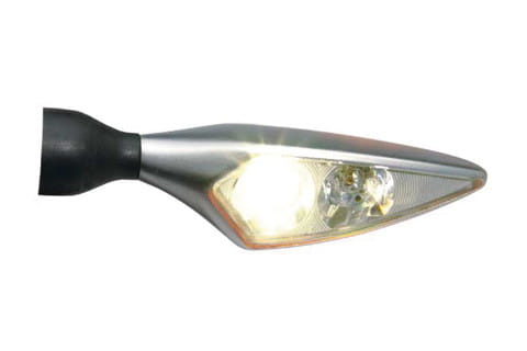 Turn signal with position light with clear glass. HighPower double LED Technology. ECE approved for front use. Small, slim and super bright. HighPower LED Technology made it possible to create an EC approved turn signal that is not just small but travel-safe since its illumination power makes it, despite the dimensions, highly visible. Approx. dimensions: 62mm wide x 23mm high x 21mm deep.