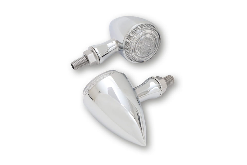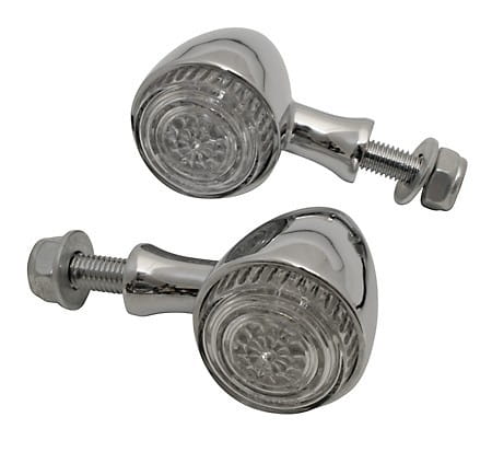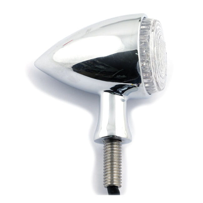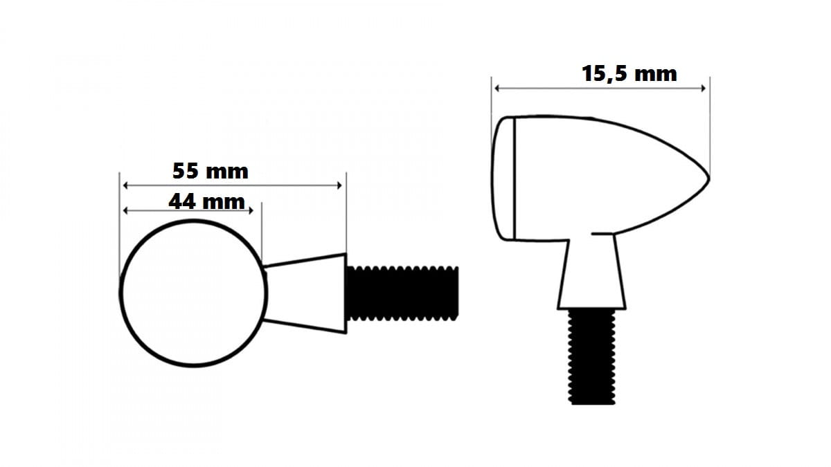 Aluminum body. With LED lighting and clear ECE approved lens. Dimensions: Housing approx. 45mm diameter, insert only 40mm. Stem length 25mm. With M10 x 1.5 threaded bolt.