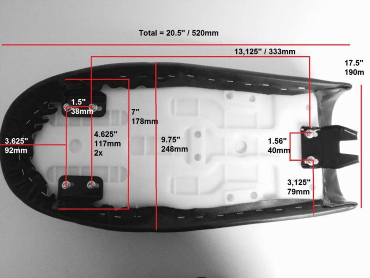 Zadupek w stylu Cafe-racer. Podstawa wykonana z tworzywa ABS. Wymiary: długość 52cm, szerokość 19 / 25cm, wysokość 12,5cm. W zestawie uniwersalne uchwyty do montażu.