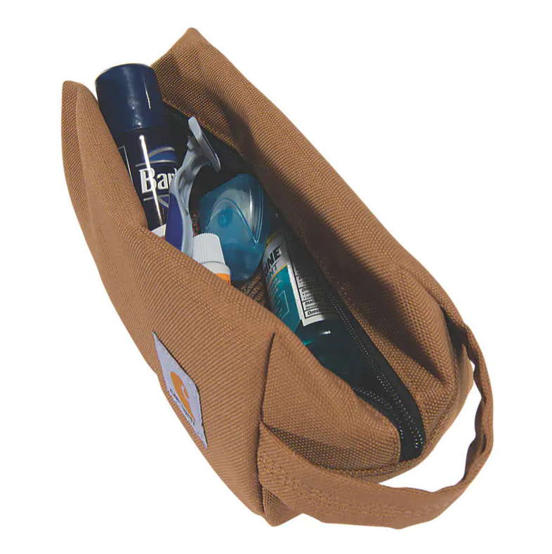 Kosmetyczka podróżna Carhartt Travel Kit zapewnia wygodę i trwałość podczas każdej podróży. Wykonana z wytrzymałego poliestru 600 denier z wodoodpornym wykończeniem Rain Defender™, ta kosmetyczka chroni Twoje kosmetyki i akcesoria przed wilgocią i uszkodzeniami. Główna komora zapinana na suwak jest w całości gumowana, co zapobiega przeciekaniu, a boczna pętla ułatwia przenoszenie.