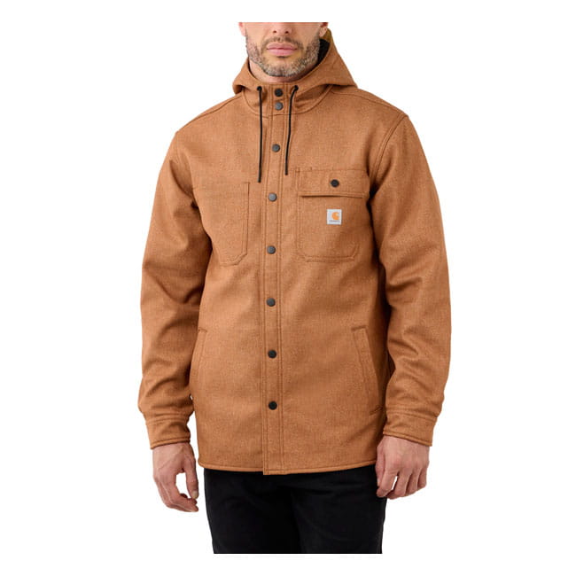 Poruszaj się swobodnie w lekkim deszczu, wietrze i zimnie. Ta męska koszula / kurtka Carhartt to wytrzymała warstwa na dni, kiedy potrzebujesz pełnego zakrycia i pełnego zakresu ruchów. Ciężki materiał twill jest ocieplony polarem i ma obszerny trzyczęściowy kaptur. Posiada membranę Wind Fighter® chroniącą przed wiatrem, a materiał posiada wodoodporne wykończenie chroniące przed lekkim deszczem.