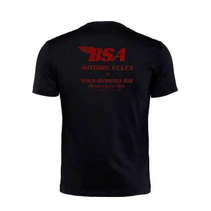 Dla fana motocykli marki BSA. Klasyczna koszulka Birmingham ma logo BSA x Merlin Motorcycle Clothing z tyłu na plecach.Wszystkie modele są wykonane z miękkiej bawełny organicznej o gramaturze 180 g/m2 z karbonizowanym wykończeniem.