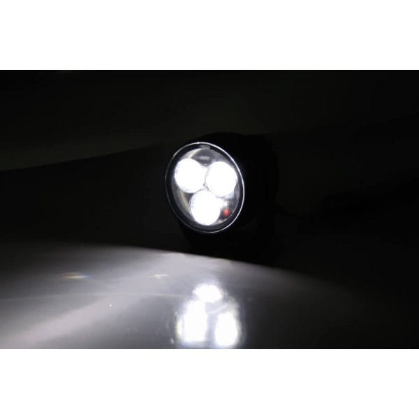 Small, powerful spotlight with 3 power LEDs (8 watts each) in a matt black aluminium housing with round lens, enclosed in a sturdy steel holder. The LED technology and the insert used produce a symmetrical, bright light for optimum perception of bikers by other road users.