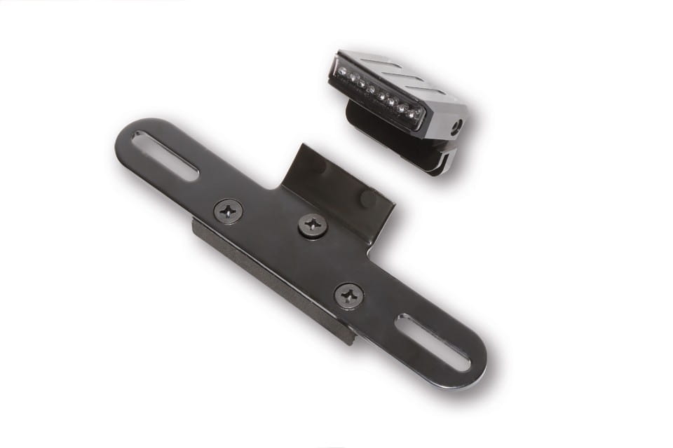 Universal LED taillight / brake light combination with license plate holder and license plate light in a black metal housing and tinted glass. The taillight is removable, E-approved.