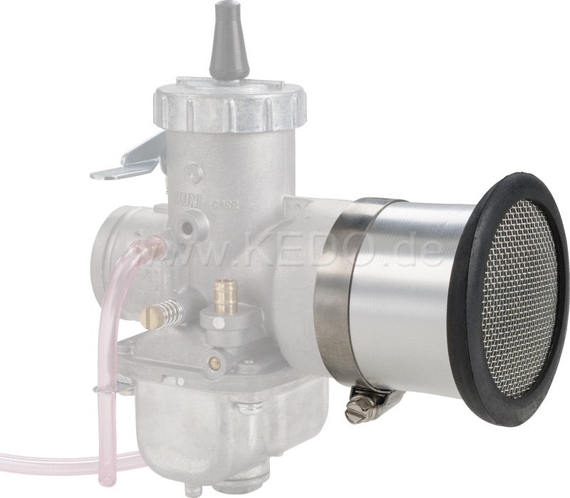 Aluminiowy lejek wlotu powietrza do gaźników Mikuni z filtrem gąbkowym. Obowiązkowa pozycja dla entuzjastów wyścigów motocykli klasycznych.