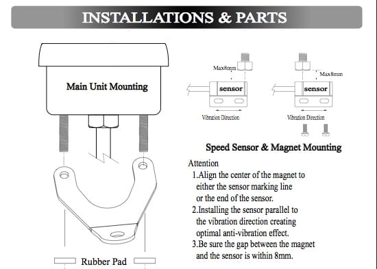 - Speedo można zamontować podtynkowo lub zainstalować za pomocą dostarczonego wspornika montażowego. Przystawka prędkości Acewell wykorzystuje kontaktron i magnes. Oba są zawarte w zestawie. W przypadku motocykli wystarczy wymienić śrubę w przednim wirniku tarczy na dołączoną śrubę magnetyczną i wyrównać kontaktron z magnesem. Następnie zaprogramuj obwód opony w Acewell. To obliczy odczyty prędkości, podróży i licznika kilometrów. W przypadku samochodów po prostu upewnij się, że magnes przechodzi przez czujnik przy każdym obrocie opony. Można to zrobić za pomocą kół, wałka napędowego lub innych obracających się części.